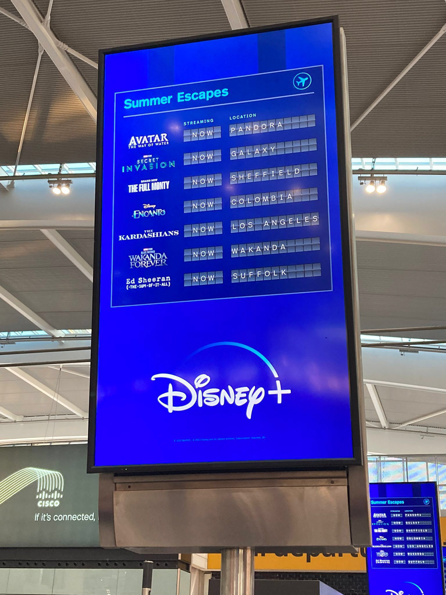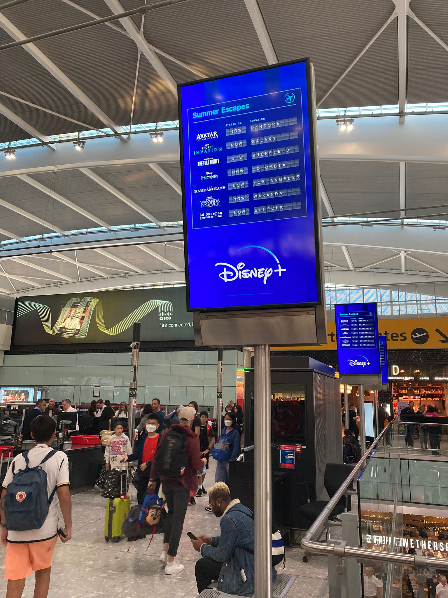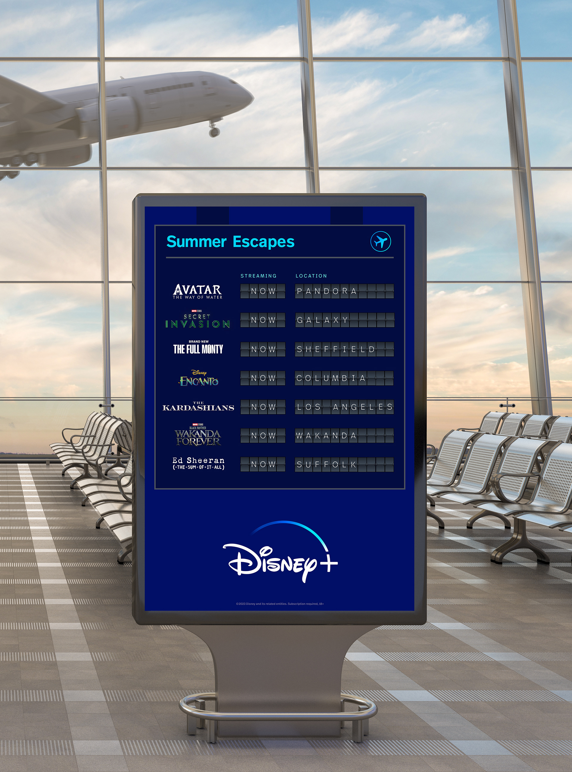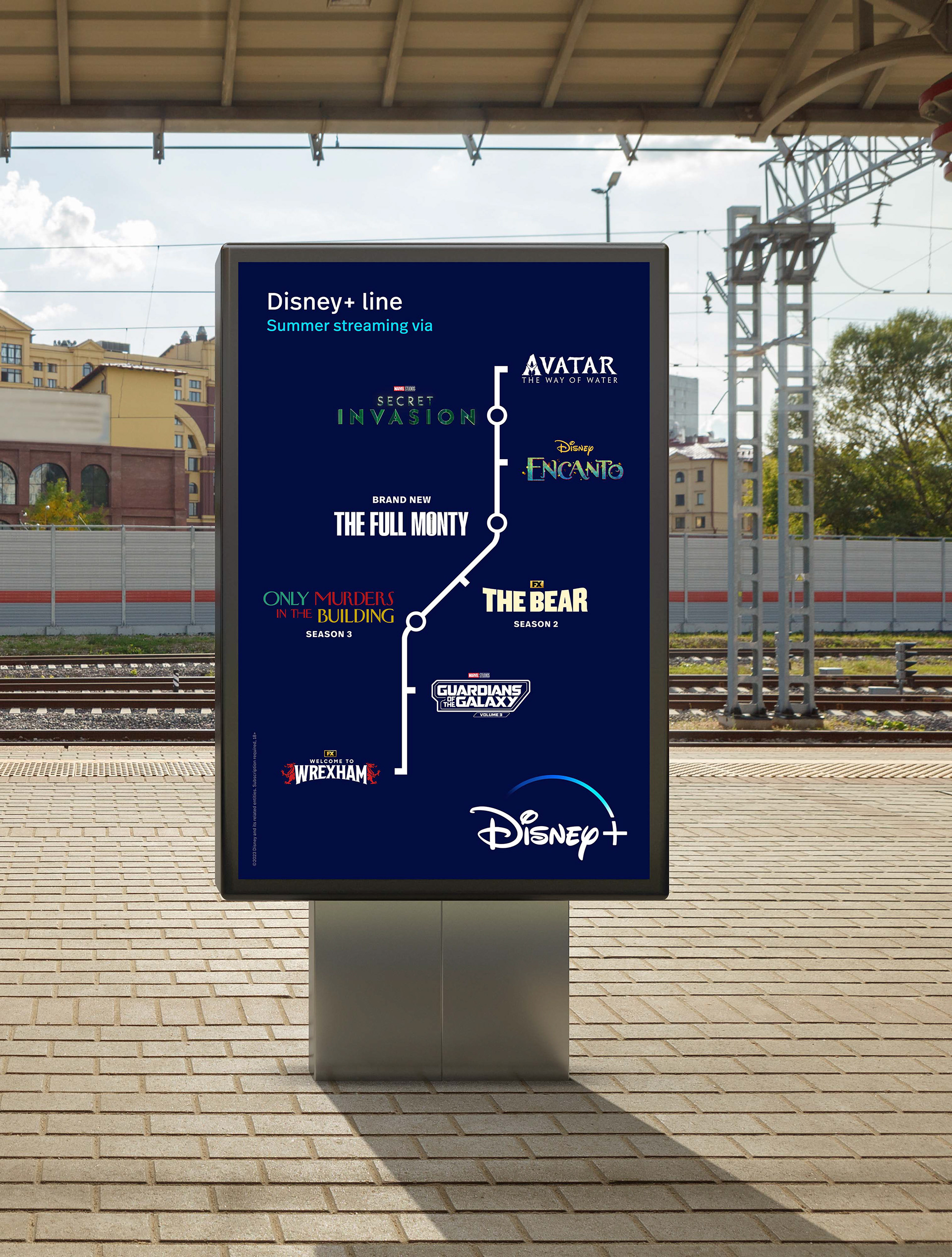 I worked across the bespoke OOH for the Disney+ summer campaign. These were designed for Airports and Train stations and were themed to match the location placements. This involved creating a flight board and a train map containing a breadth of upcoming shows arriving to Disney+ while adhering the brand guidelines and styles.