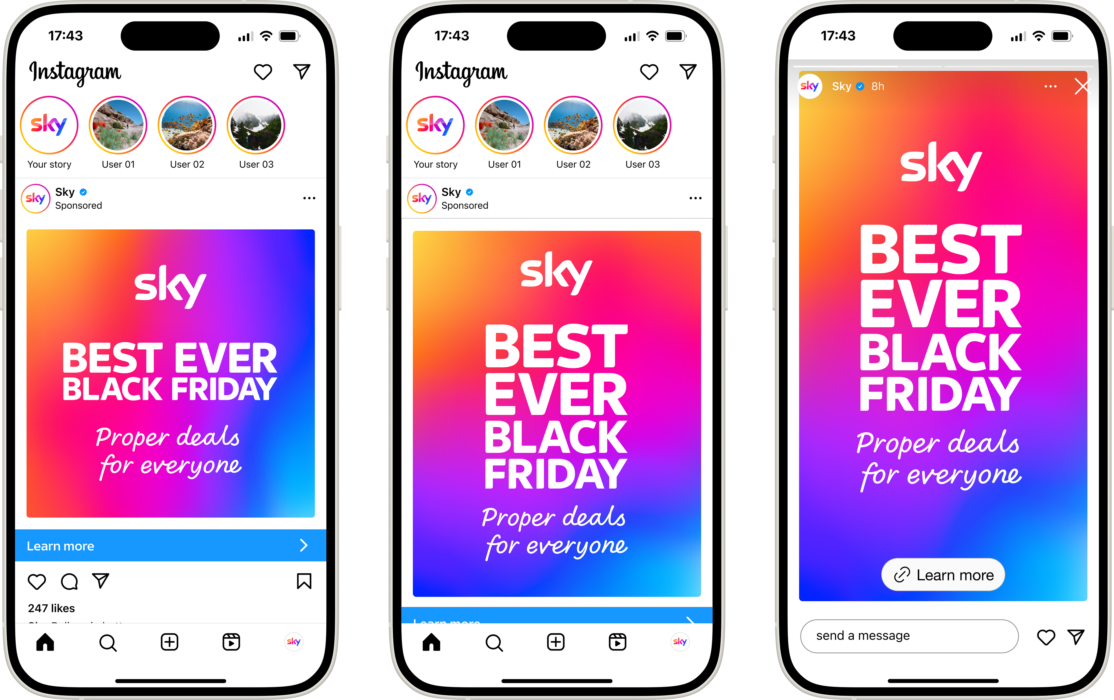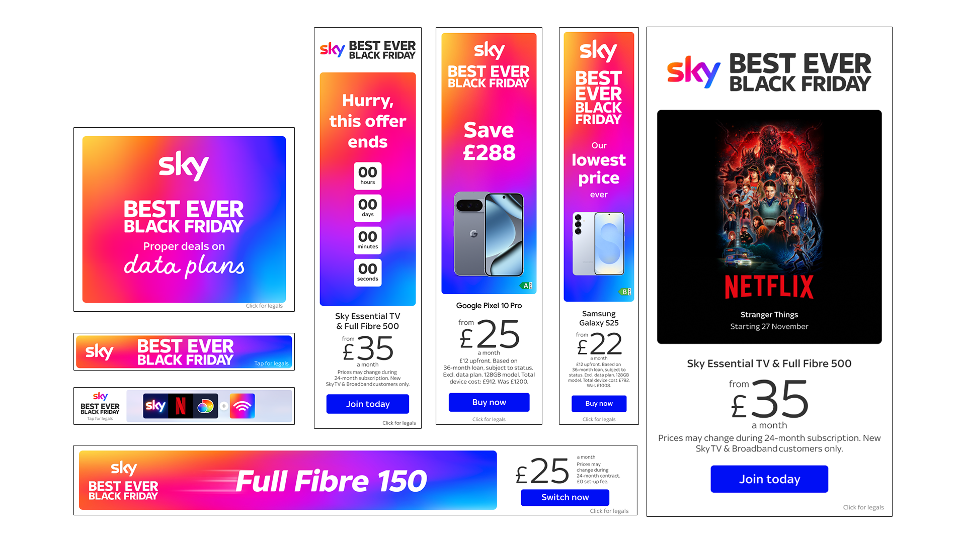 I worked on the digital side of Sky’s Best Ever Black Friday campaign, designing a wide range of assets to support the advertising campaign across social and digital channels. Collaborating closely with the advertising team, I ensured creative aligned with the broader campaign strategy, and worked with the dot.com team to make sure designs flowed seamlessly from digital ads to the website. I also provided feedback to fellow digital designers to maintain consistency and quality across all deliverables, creating a Figma library to streamline this process. My work helped bring a bold, cohesive digital experience to life, contributing to Sky’s goal of delivering its most engaging and high-impact Black Friday yet.